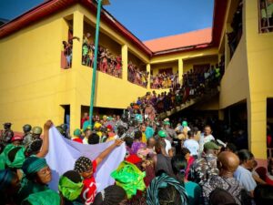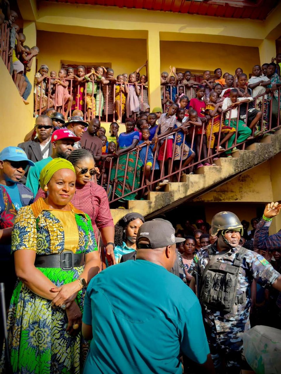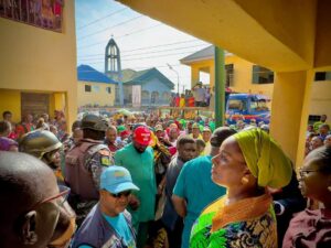 The first lady of Anambra State, Mrs. Nonye Soludo has visited Unity Primary School, Umuoba Anam, where over one thousand people who were displaced by flood are currently taking shelter.