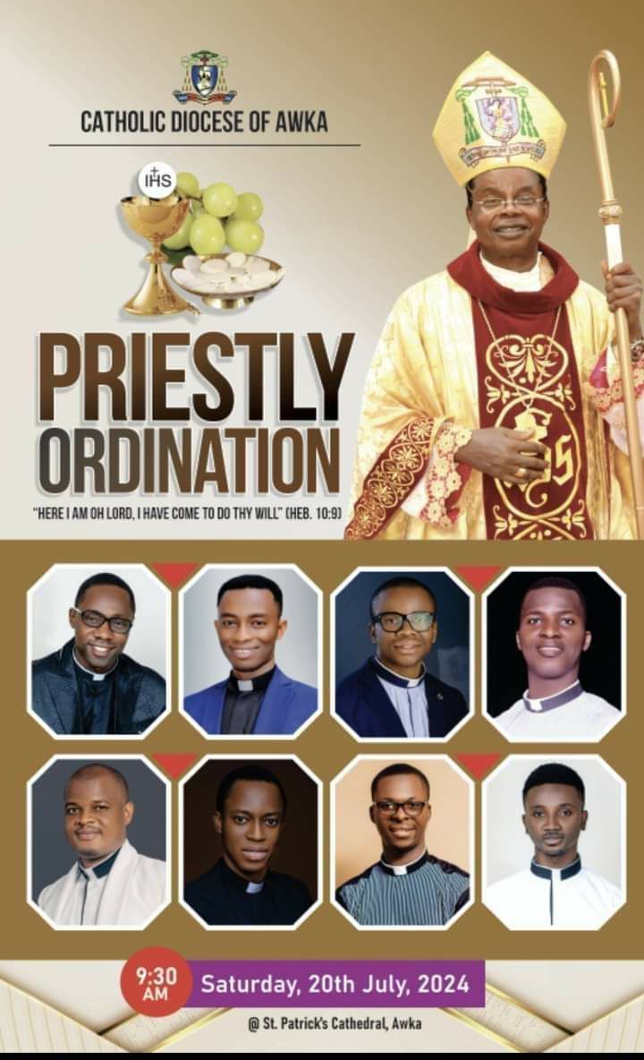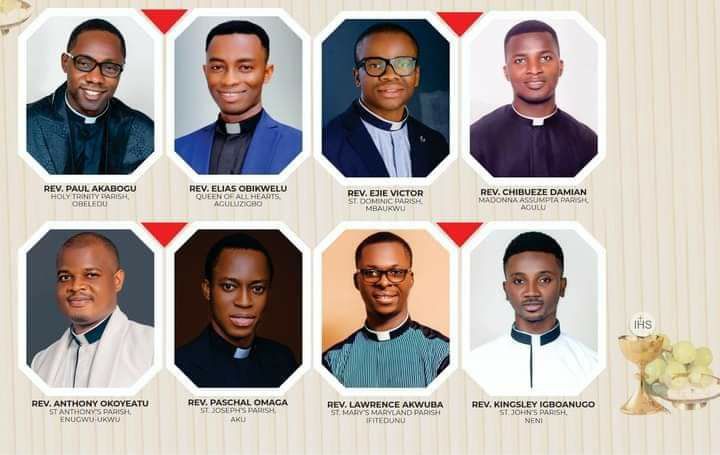 The newly ordained priests are; Paul Akabogu, Elias Obikwelu, Victor Ejie, Damian Chibueze, Anthony Okoyeatu, Paschal Omaha, Lawrence Akwuba, and Kingsley Igboanugo