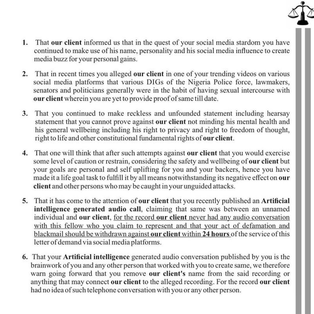 “Recently, you alleged in one of your trending videos on various social media platforms that various Deputy Inspectors General of the Nigeria Police Force, lawmakers, senators, and politicians generally were in the habit of having sexual intercourse with our client, yet you have not provided any proof of these claims to date.”
