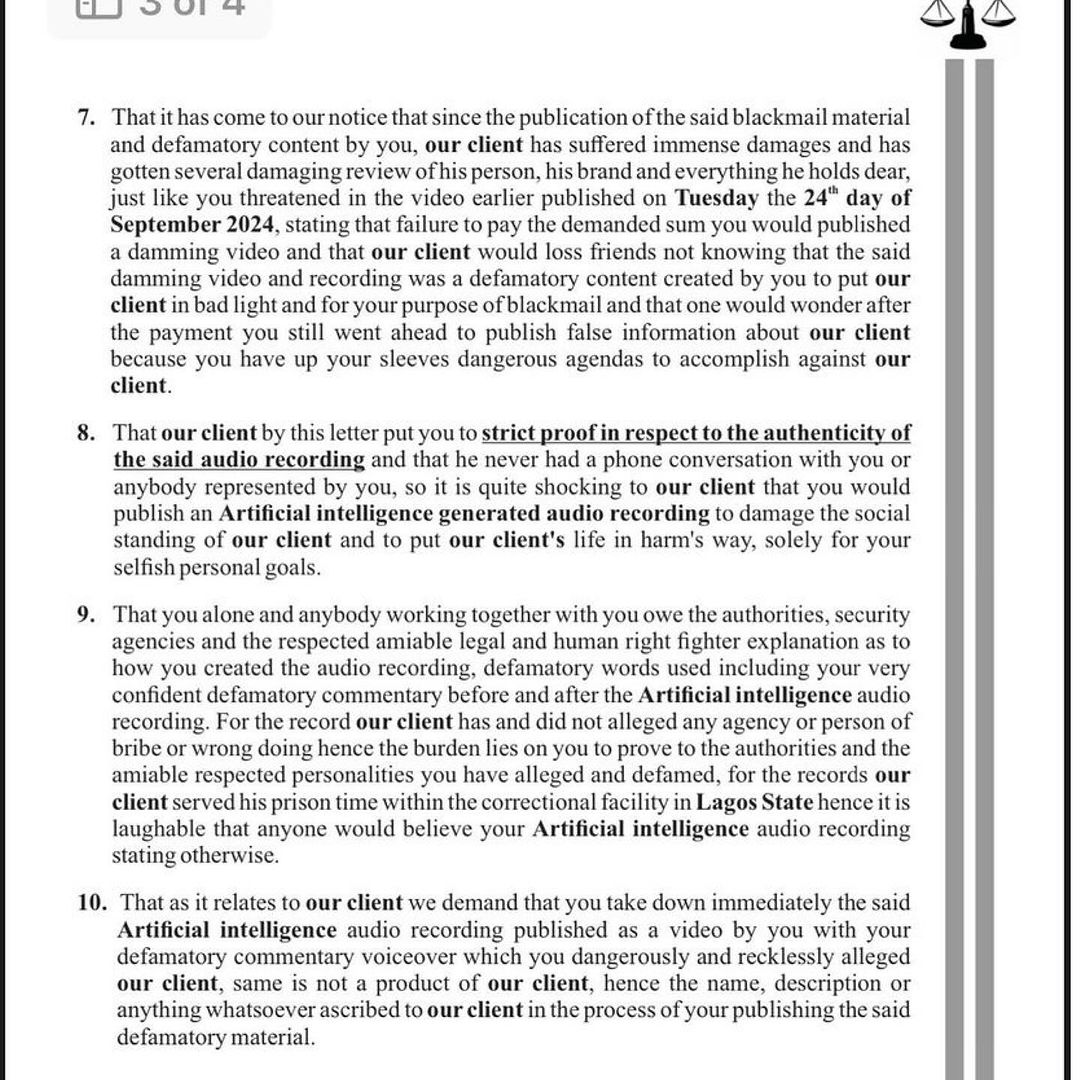 “We, therefore, demand, on behalf of our client, a written apology published in two national daily newspapers, a video recording of your apology to our client shared on all your social media platforms, a commitment to refrain from reporting or publishing defamatory content against our client, and the payment of ₦1,000,000,000 in damages within 24 hours of this letter via social media or any other means.”