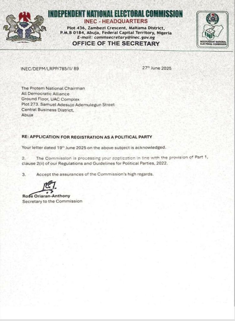 INEC acknowledged receipt of ADA’s application, which was submitted by the party’s Protem National Chairman on June 19, 2025.
