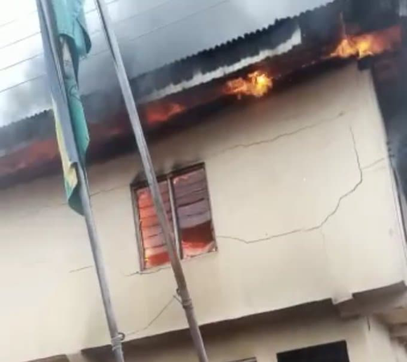 In the video, the roof of a storey building police station is seen on fire.