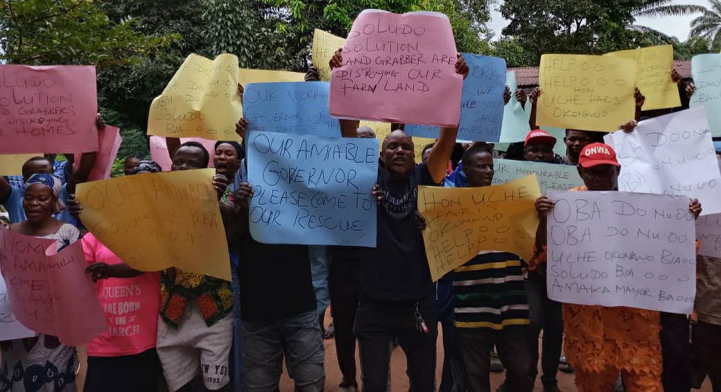 The protesters carried placards with the inscriptions, “Soludo come to our rescue’, ‘We have no other place call our own land’, ‘Bukham Group in collaboration with few of our sons have sold some plots of our land’, ‘We can’t be tenants in our own land’, ‘They have destroyed our buildings, farmland,”among others.