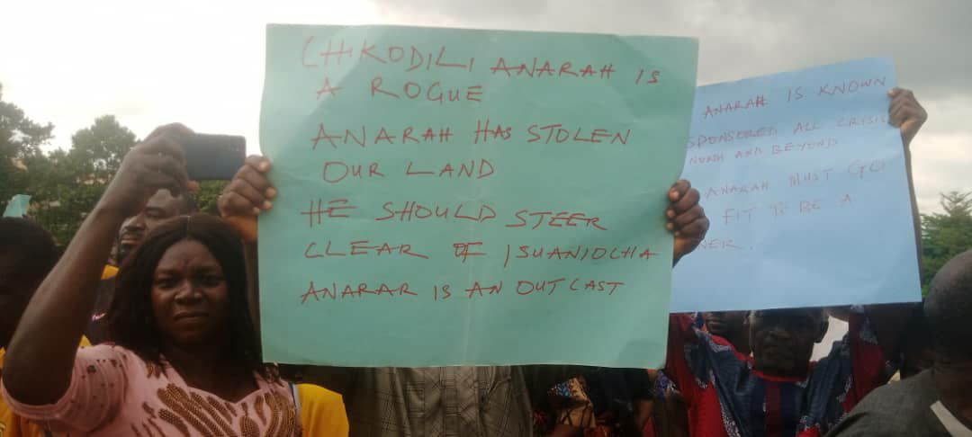 The protesters held placards the with different inscriptions like …”Igweship election was conducted under crisis and confusion”. “We reject Mkpuorah Ngini”. “Ngini family cannot dictate for Isuaniocha”. “Chikodi Anara, Igbakigba leave Isuaniocha alone”. “Isuaniocha need peace not war”. “We have suffered prolonged period of crises sponsored by the Commissioner for Homeland Affairs, Chikodi Anara”. Governor Soludo please listen to the good people of Isuaniocha. do not listen to your Dubious Commissioners Tony Nwabunwanne and Chikodi Anara among other write ups.