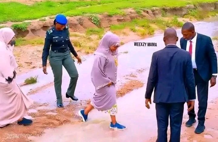 The convoy of Bauchi State First Lady Aisha Bala Muhammad was stranded in floodwaters on Saturday while on her way to commission a healthcare centre in the Jamdan area of the state.