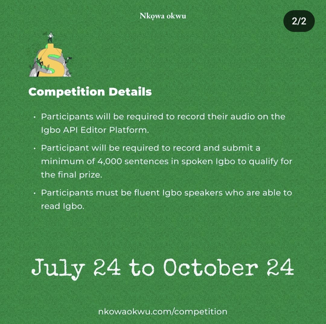 Sign up to start July 24⤵️ nkowaokwu.com/competition and view our promotional video in Igbo! The page includes all the details but the summary are –