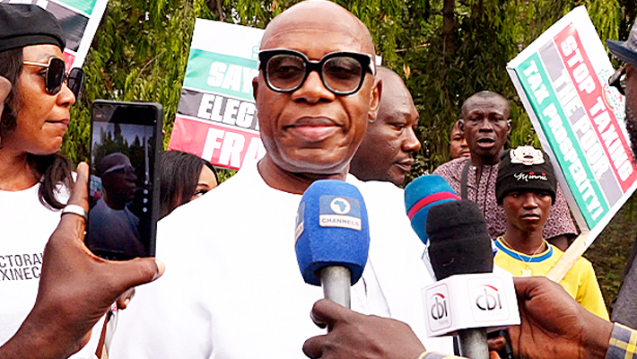 Former transport minister Rotimi Amaechi rallied Monday with demonstrators outside the National Assembly, demanding lawmakers restore mandatory real-time electronic transmission of election results in pending reforms, just hours before a crisis session on the issue.