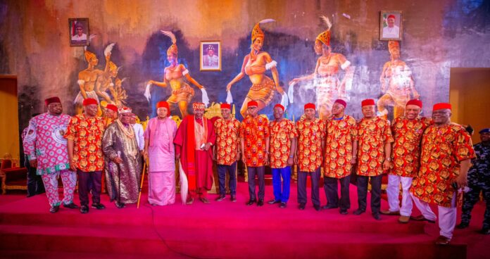 L-R: PDP vice presidential candidate, Ifeanyi Okowa; Ezeudo II of Amaifeke, Dr E. C. Okeke; PDP presidential candidate Atiku Abubakar during a courtesy visit to the monarch on December 17, 2022. @atiku/Twitter