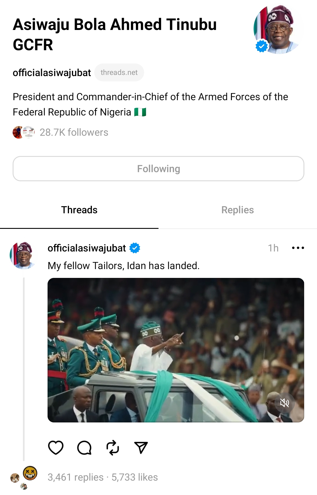 President Tinubu wasted no time in making his presence known on Threads, as he shared his inaugural video as the country’s leader.
